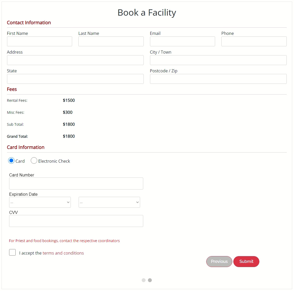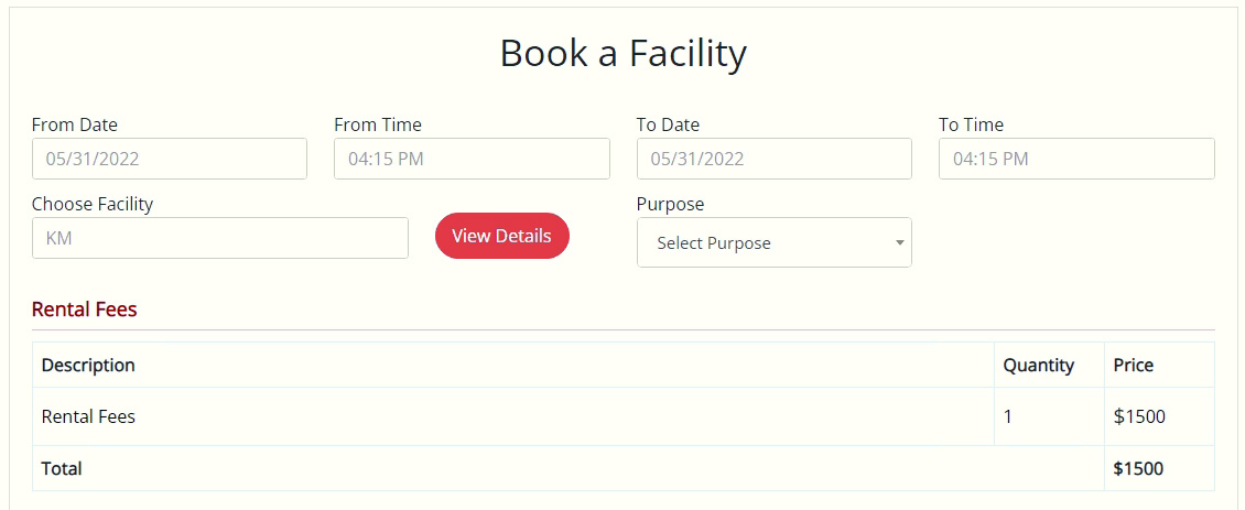 - Select a facility user wants to book. This will show rental options available along with its fees.