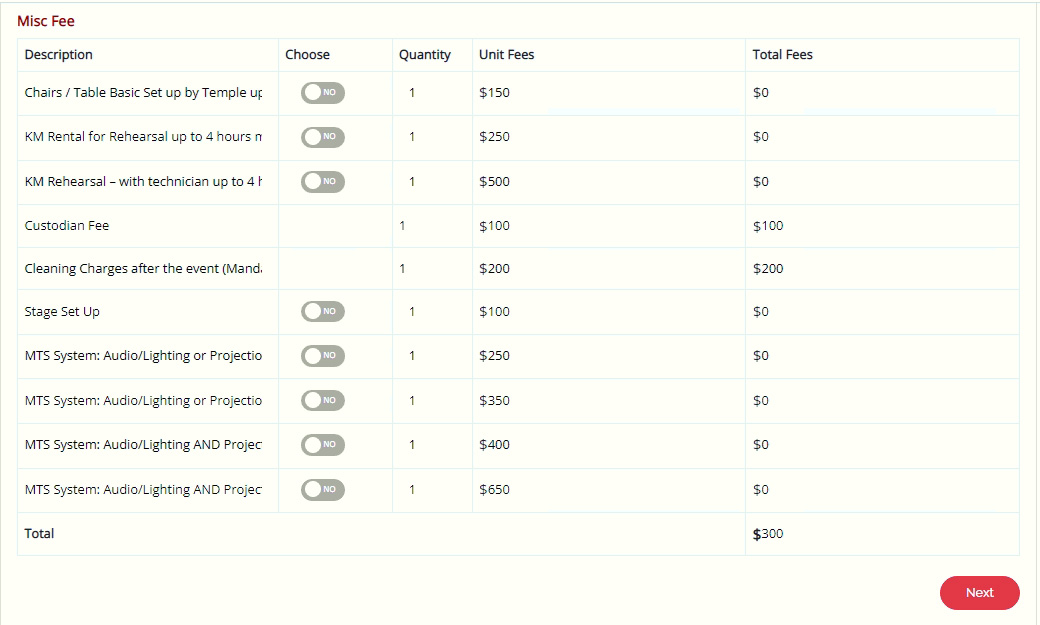 - User can choose what all options he or she wants to avail from Misc Fee table. Some of the items are mandatory.